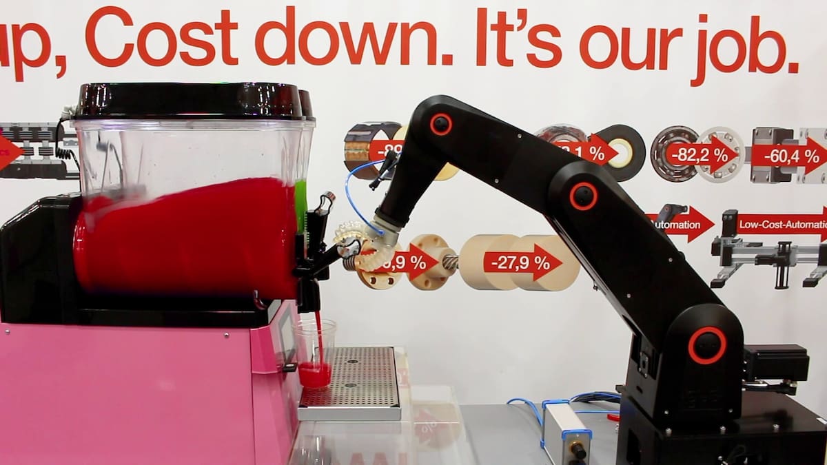 With its flexible workspace, the igus robolink robot arm is very well suited for the complex motion sequences. Thanks to its low price and simple programming, it is perfect for automation as in this case of catering applications. In combination with SoftGripper's four-finger gripper, handling the plastic cup and the ice cream machine is a breeze. The end effector is characterized by its versatility. In addition to its four gripper fingers, it also has a suction cup. This allows the cup to be gripped securely without pressing it in.